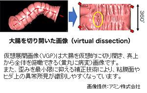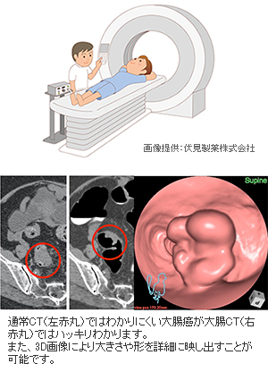 大腸を炭酸ガスにより膨らませた状態でCTを撮影します。撮影データから様々な3D画像を作成し、大腸がんや大腸ポリープを 見つけることができます。日本をはじめ諸外国で検査精度の検証が行われ、6ミリより大きなポリープの検出能は大腸内視鏡と比べ、同等以上とされています。